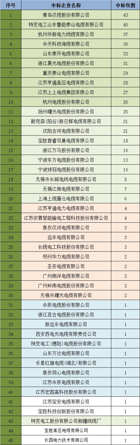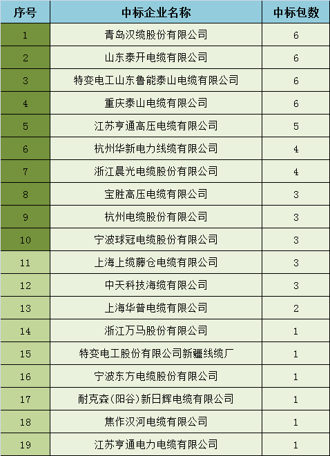 前十家电力电缆企业中标包数占总数的64%,分别是青岛汉缆股份有限公司、特变电工平博(中国)鲁能泰山电缆有限公司、杭州华新电力线缆有限公司、中天科技海缆有限公司、平博(中国)泰开电缆有限公司、浙江晨光电缆股份有限公司、重庆泰山电缆有限公司、江苏亨通高压电缆有限公司、江苏上上电缆集团有限公司、杭州电缆股份有限公司。