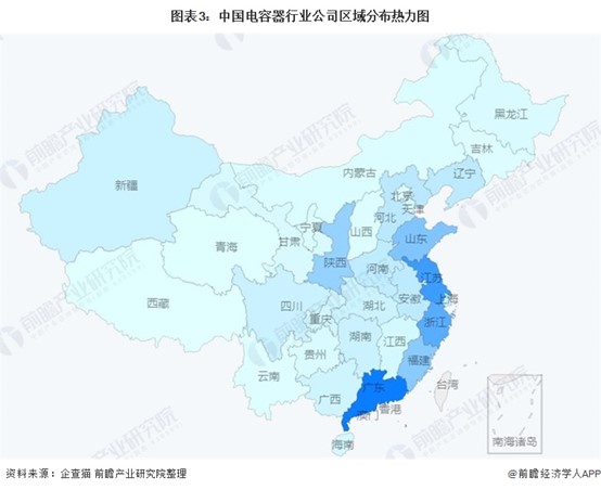 电容器行业产业链区域热力地图:企业集中于广东省、江苏省、浙江省