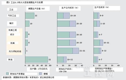 生产力方面。在接下来的五年到十年,工业4.0将会对德国制造业领域内的更多企业产生推动作用,并提高生产力,预计产值讲会从900亿欧元提高到1500亿欧元。不计算材料的成本,生产成本可能会提高15%到25%;如果把材料成本计算在内,生产成本可能会提高5%到8%。工业各行业差别很大。工业零部件制造商有望实现生产力最大的一些改进(20-30%),例如,汽车公司可以预期增加10-20%(图3)。