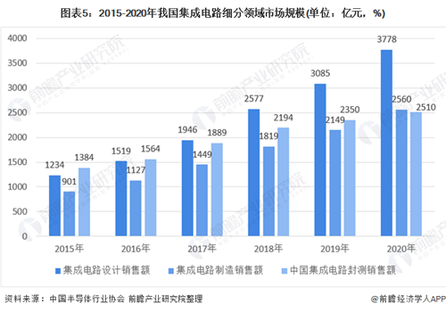 图表5:2015-2020年我国集成电路细分领域市场规模(单位:亿元,%)